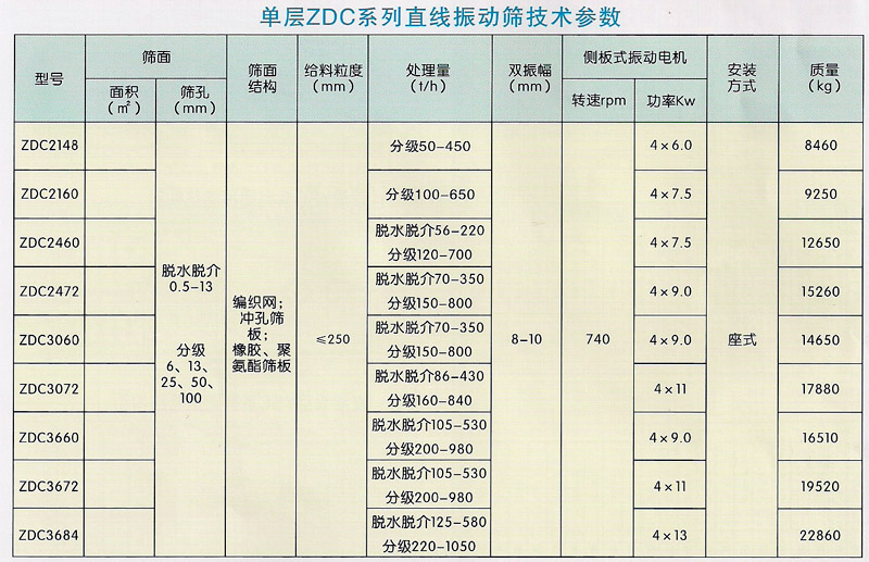 ZDC系列直線振動篩是一種利用側(cè)板式振動電機為激振源的篩分機械,廣泛適用于水電、煤炭、冶礦山、建材、化工等行業(yè)對中、粗物料進行分級和脫水。